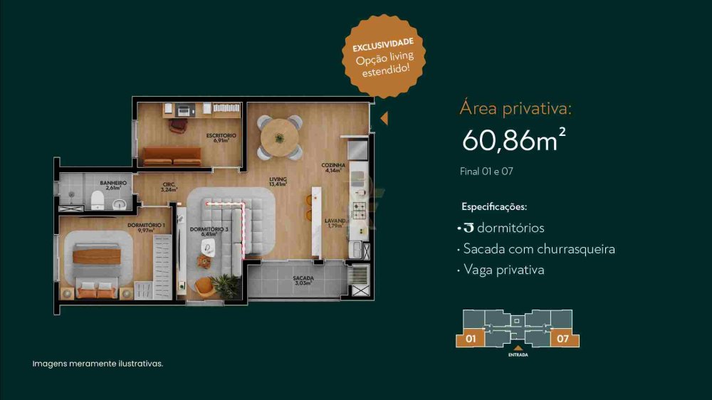 - Área Privativa: 60,86 m²