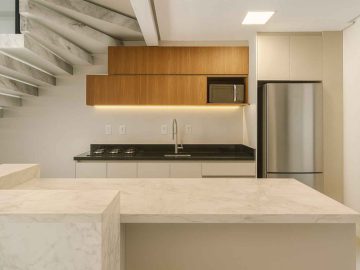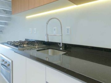 Cozinha mobiliada com bancada de pedra