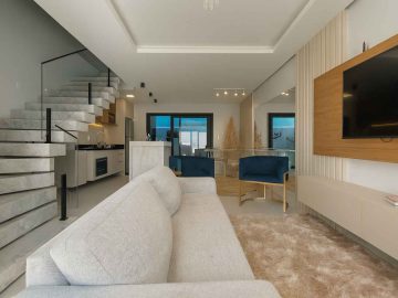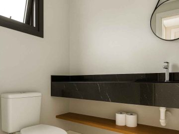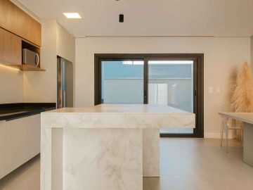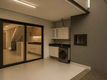 Este sobrado apresenta ambientes bem distribuídos, com área social integrada e mobiliada, proporcionando funcionalidade e melhor aproveitamento dos espaços. As três suítes garantem privacidade e conforto aos moradores, enquanto a sacada amplia a iluminação e ventilação natural. O padrão construtivo inclui acabamentos modernos e elementos que valorizam o estilo atual, como aberturas em alumínio preto e cozinha com bancada em pedra.