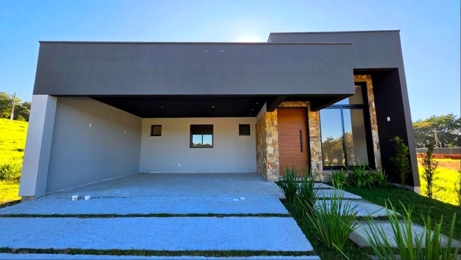 A fachada conta com revestimento em pedra madeira natural, linhas modernas e paisagismo frontal, garantindo identidade visual sofisticada e valorização do imóvel. O projeto prioriza iluminação natural e integração entre os ambientes sociais.
