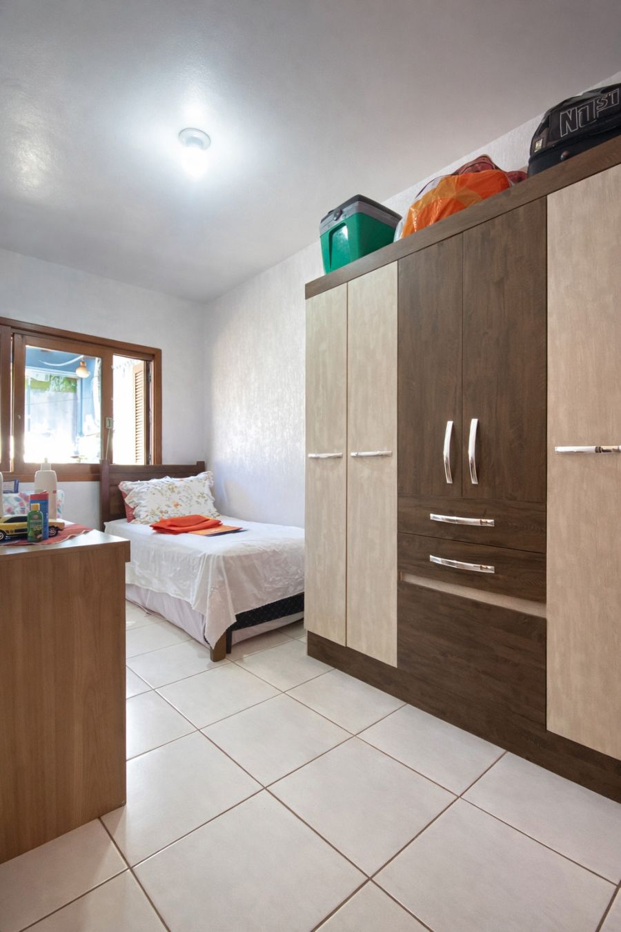 Conta com mobiliário no dormitório principal, incluindo roupeiros, cama e ar-condicionado split, além de cozinha com bancadas instaladas. Dispõe de água encanada, internet por fibra óptica e apresenta estado de conservação impecável.