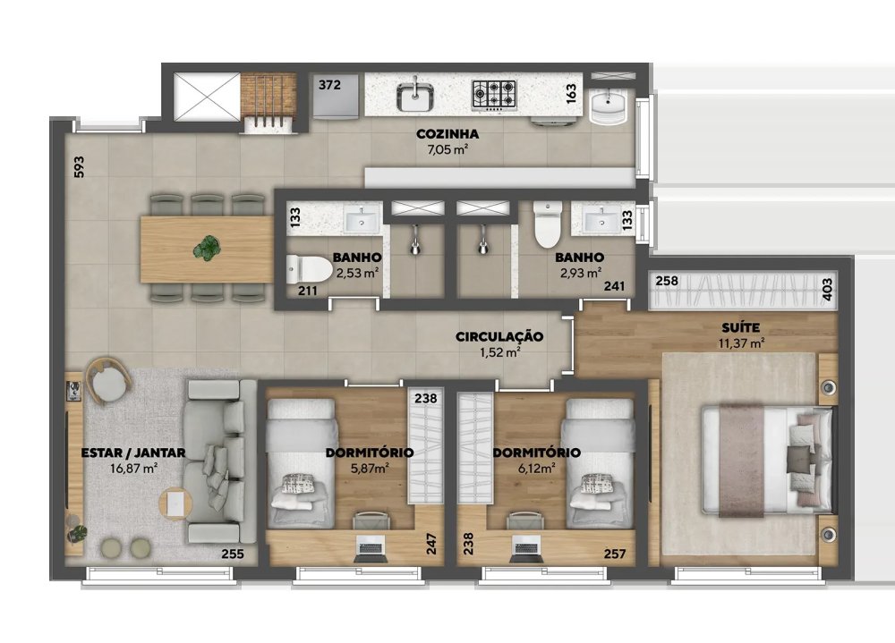 Com 87m² de área privativa e 67,57m² de área total, este imóvel foi pensado para proporcionar o equilíbrio perfeito entre elegância, conforto e funcionalidade. São 3 dormitórios, sendo uma suíte espaçosa, banheiro social e um lavabo moderno, ideal para receber visitas com sofisticação. A área social é integrada, com living amplo, excelente iluminação natural e ventilação cruzada - tudo isso conectado a uma cozinha prática e bem distribuída.