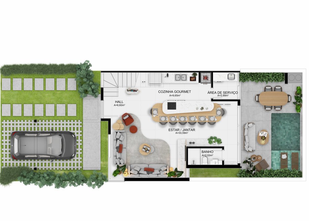 No térreo possui uma vaga de estacionamento coberta e espaço para uma segunda vaga, hall de entrada, uma ampla sala de estar integrada com jantar e cozinha gourmet, lavanderia separada e pátio de até 62m².