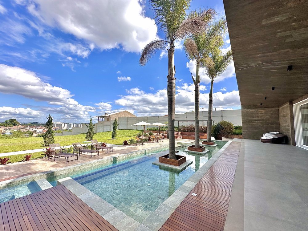 Área externa integrada à piscina com vista panorâmica.