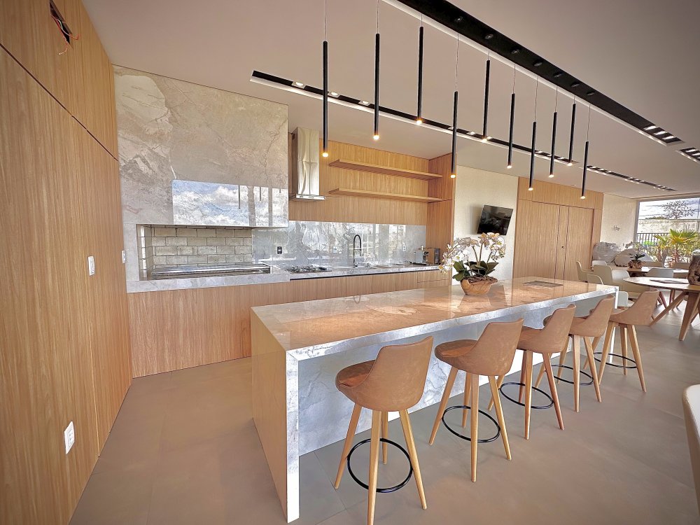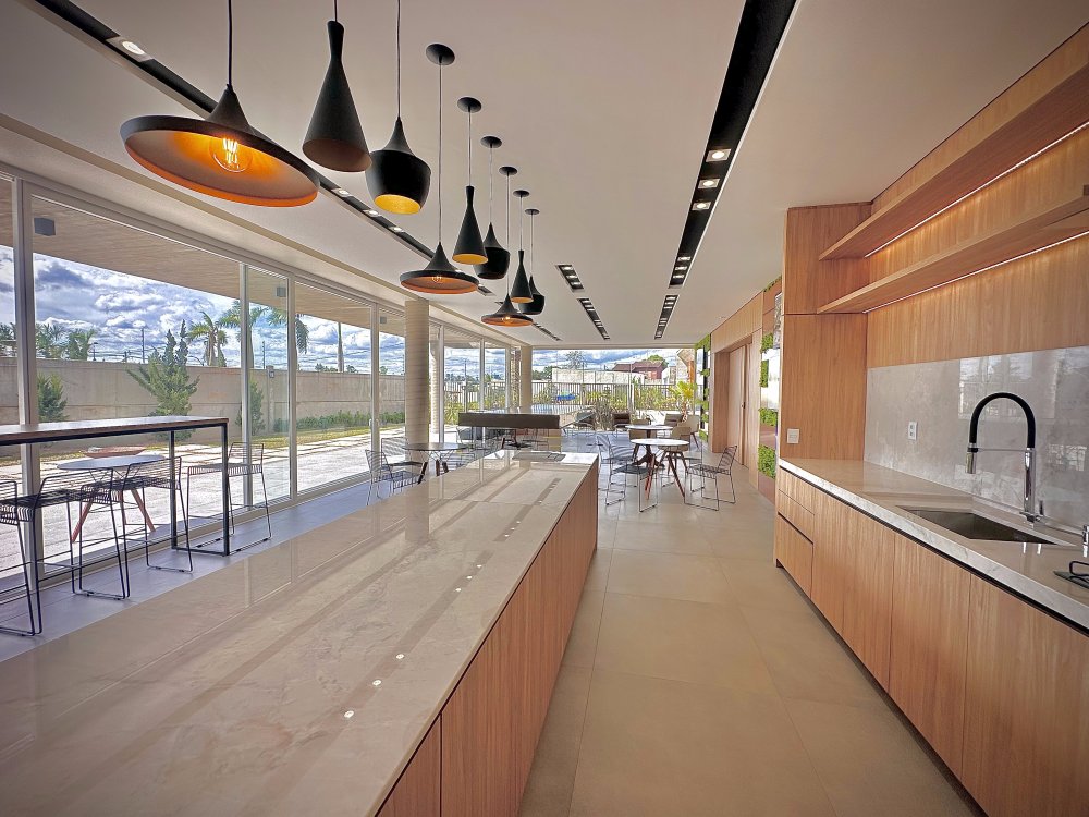 Espaço gourmet com cozinhas de apoio.